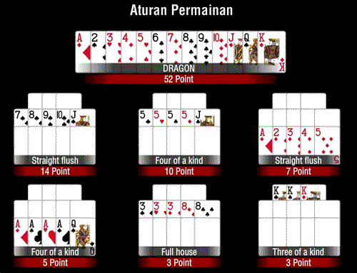 Kartu yang sudah dibagi mempunyai susunan yang bermacam-macam dengan tingkatan kekuatan atau kemenangan. Berikut macam susunan kartu :